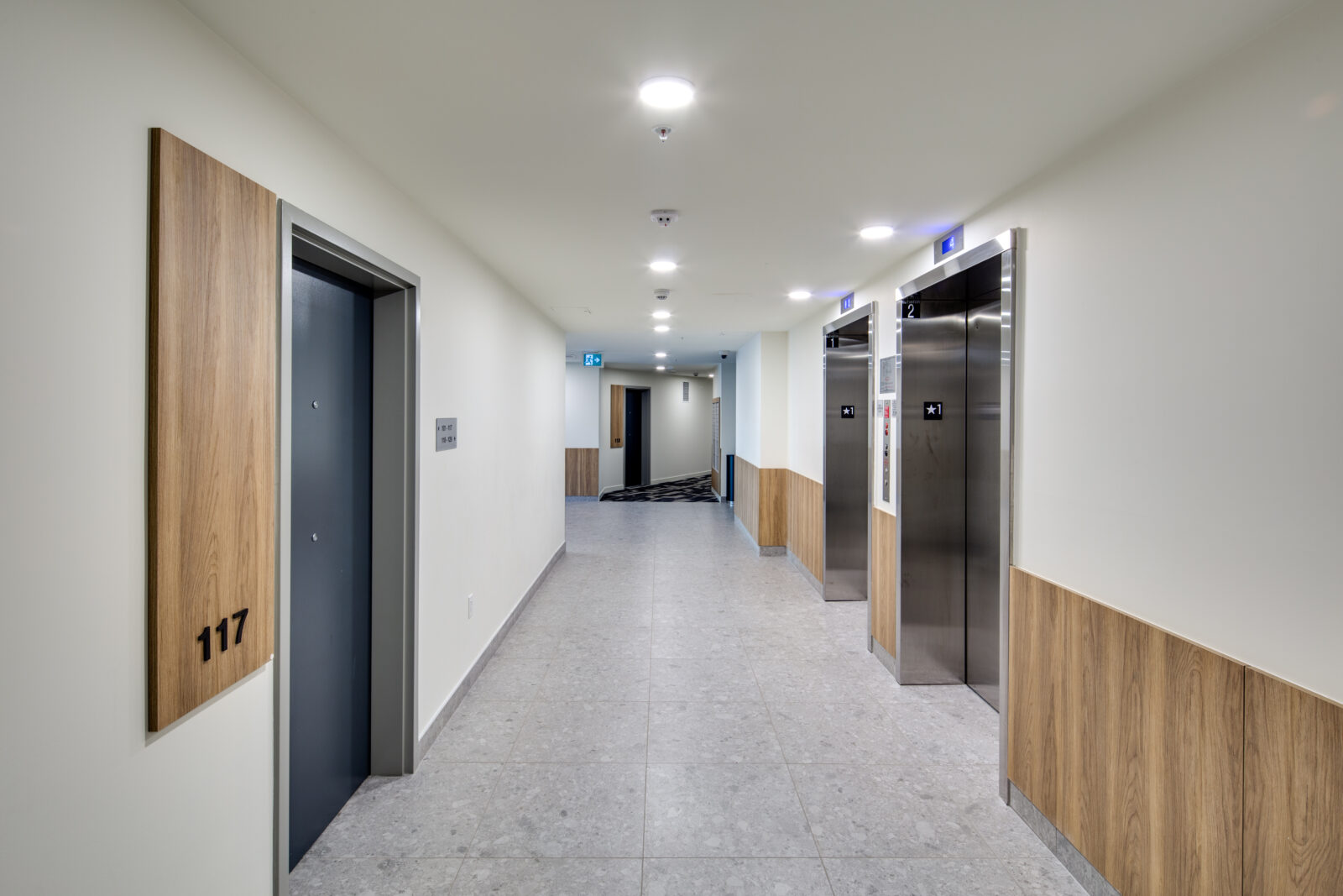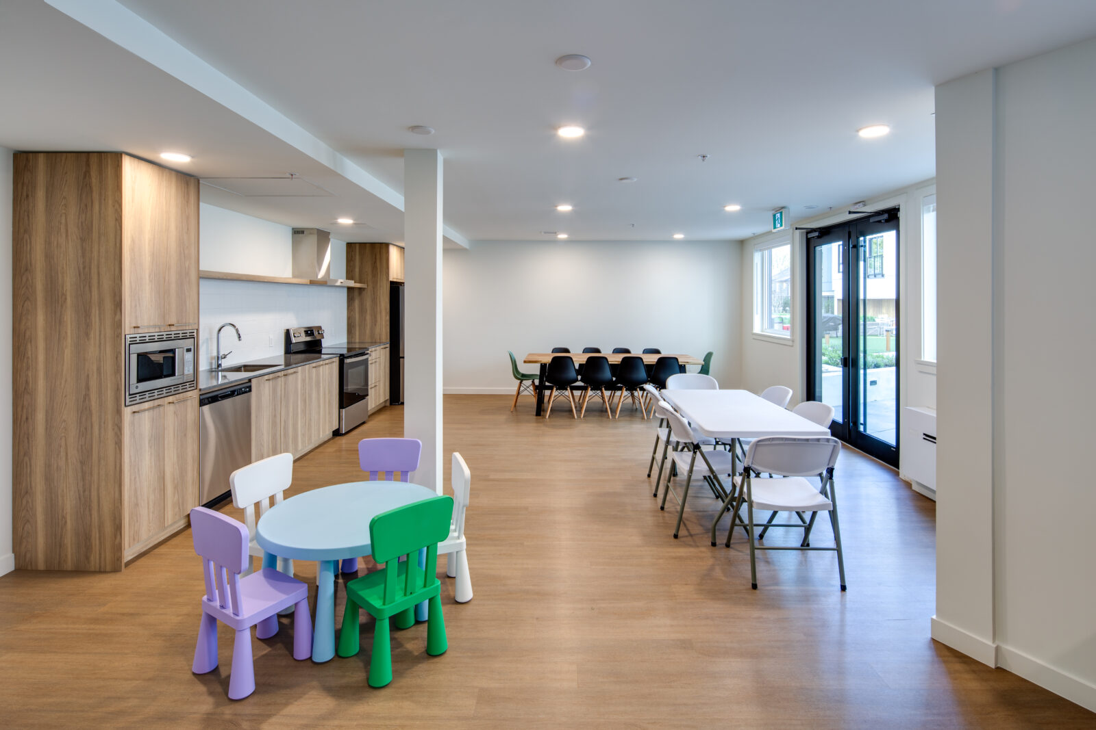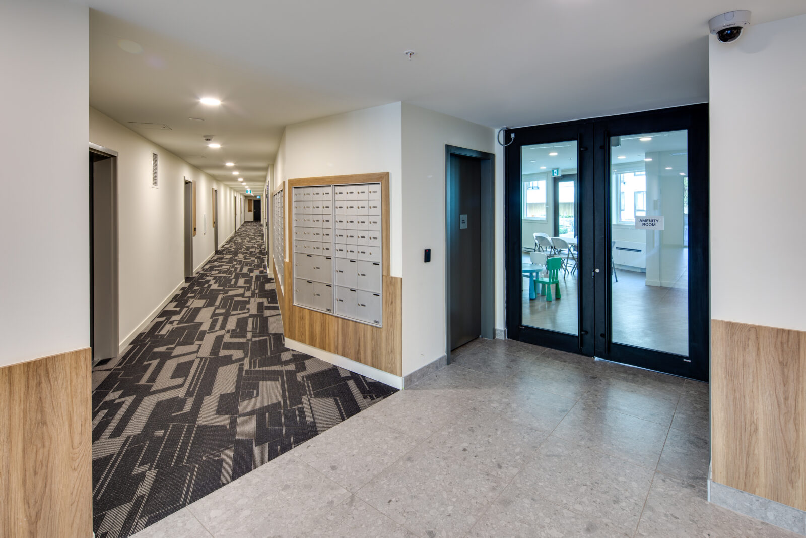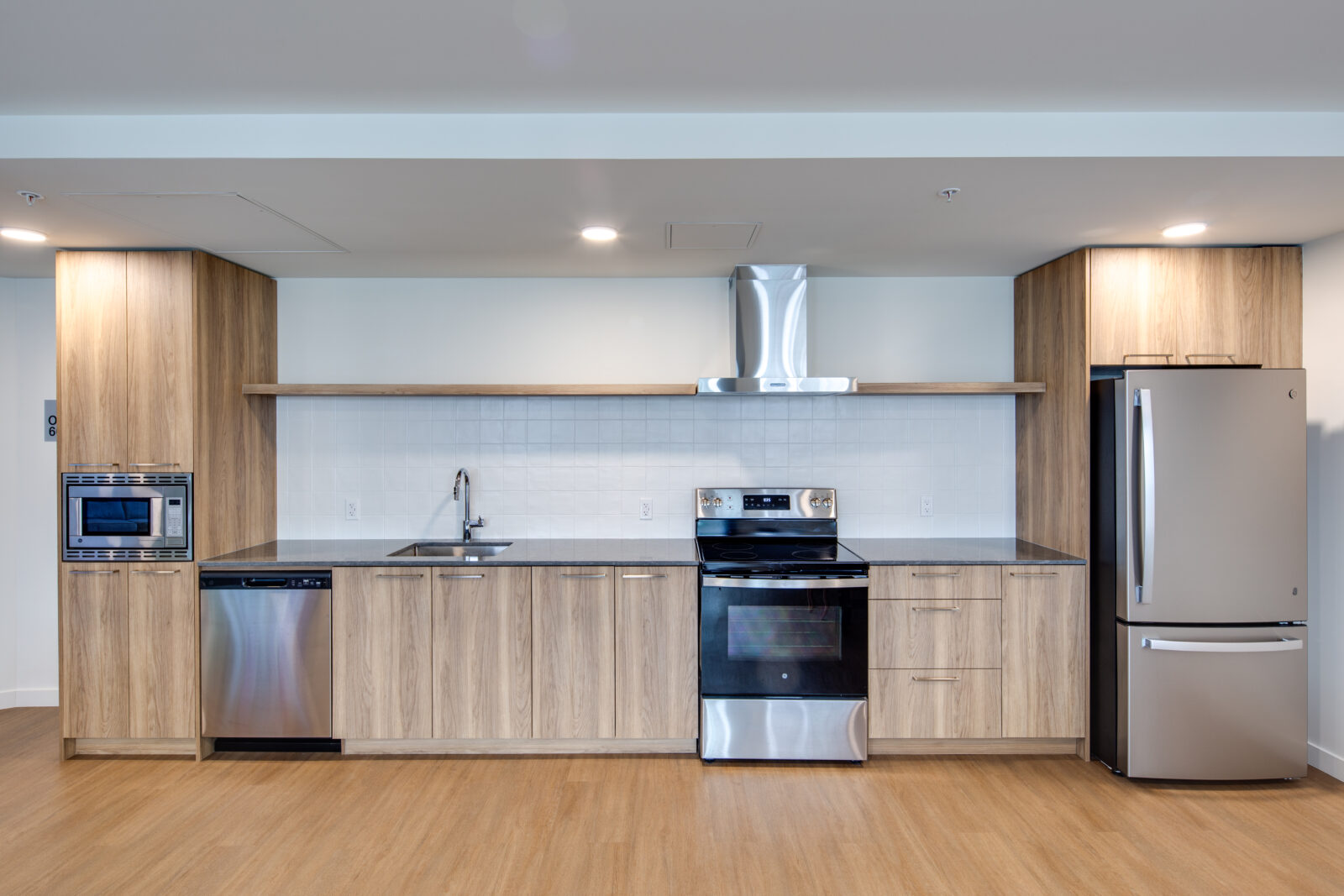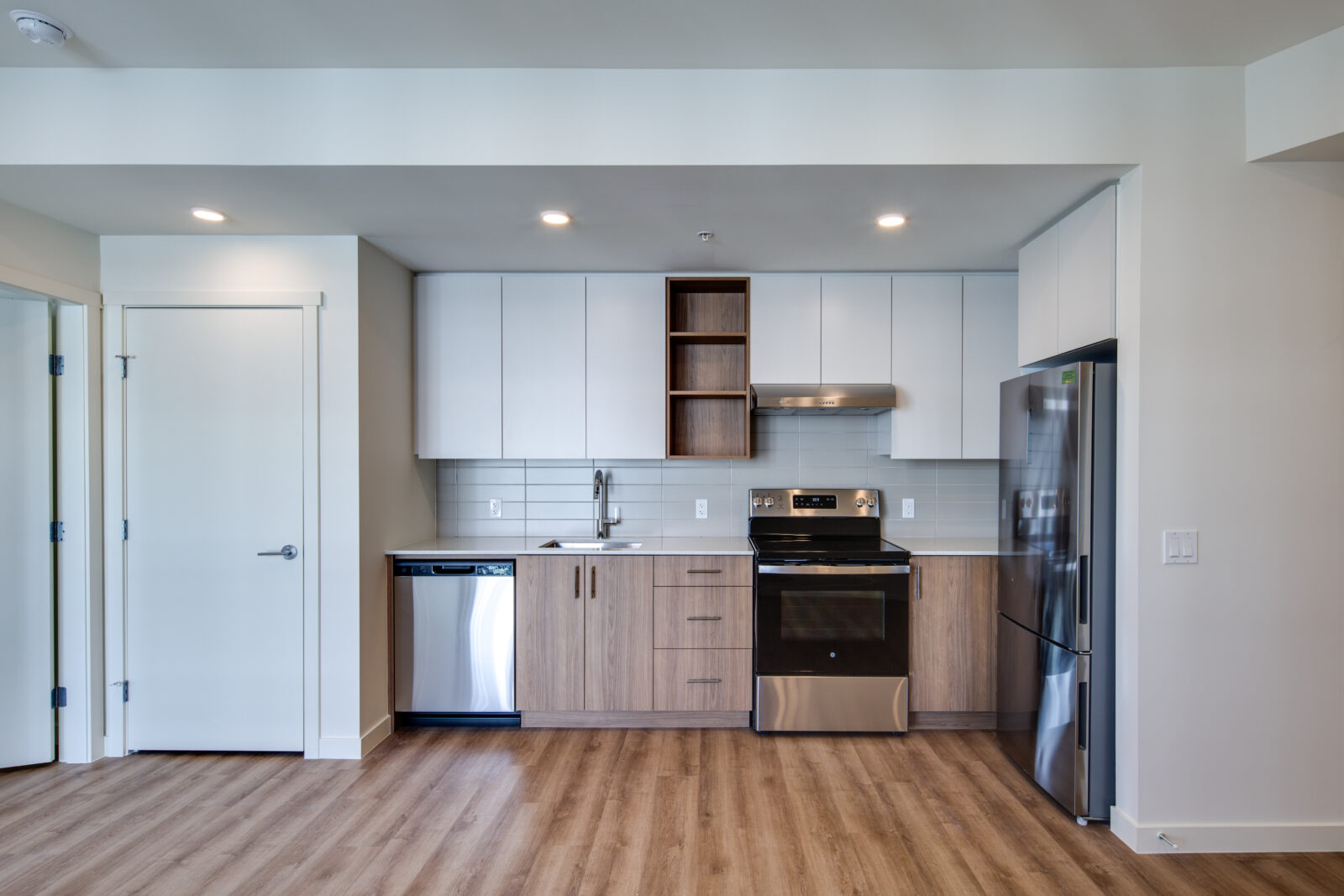 Catalyst Community Development brings to Burnaby a rental community offering 203 thoughtfully designed homes with contemporary living spaces ranging from studios to 3 bedroom units. Rich wood tones mix with white cabinets in the kitchens, with durable quartz counters and porcelain backsplashes. Bathrooms continue the warm wood with a vinyl plank floor, and durable shower surrounds. An important element of this project was the offering of fully accessible units, working with BC Building Code and BC Housing guidelines. Our goal was to ensure seamless integration of all requirements through thorough research and collaboration with our other consultants.